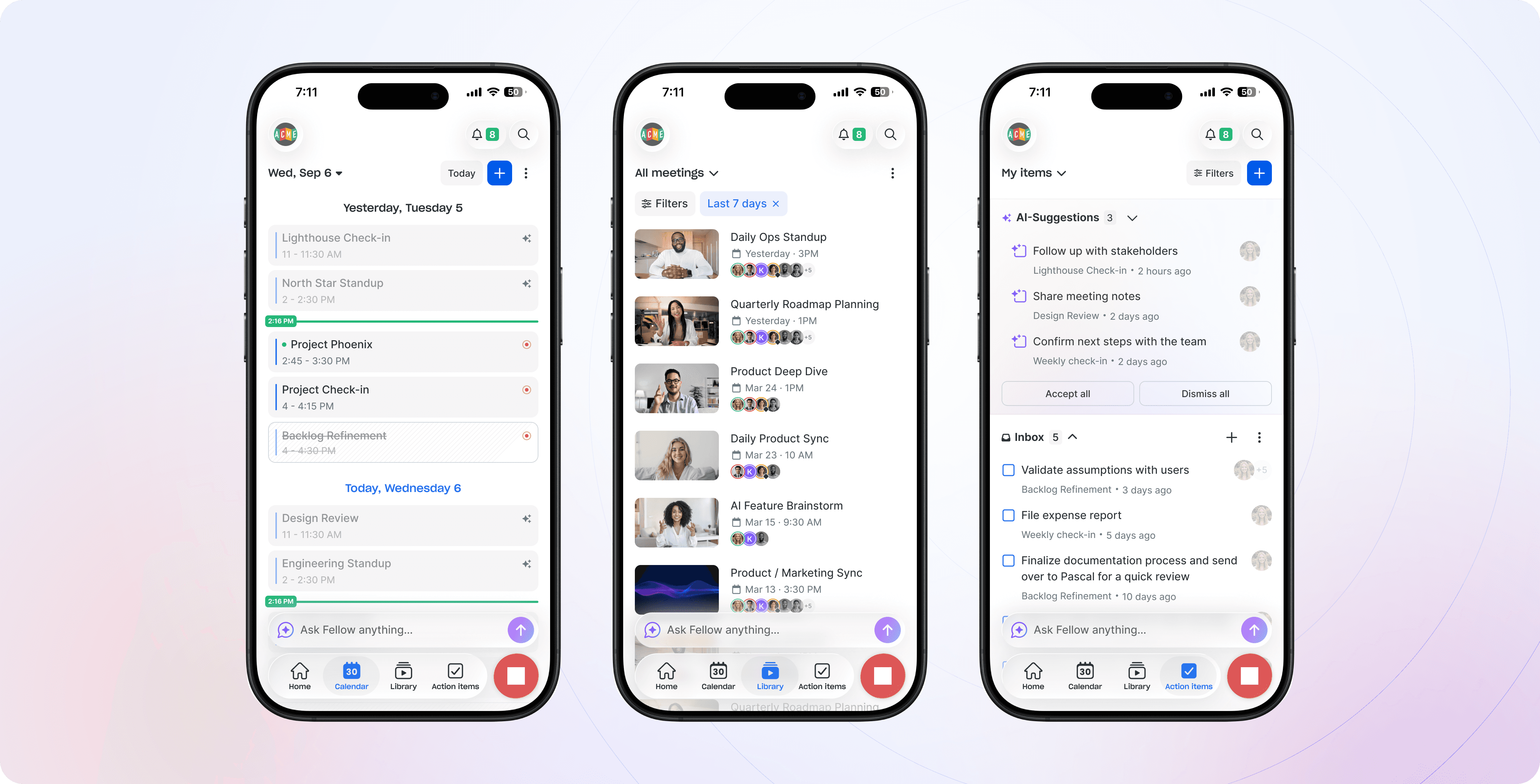 The Fellow mobile app is built to handle everything you need before, during, and after a meeting, right from your pocket. Whether you're heading into a conference room, working from a coffee shop, or catching up between calls, Fellow moves with you.