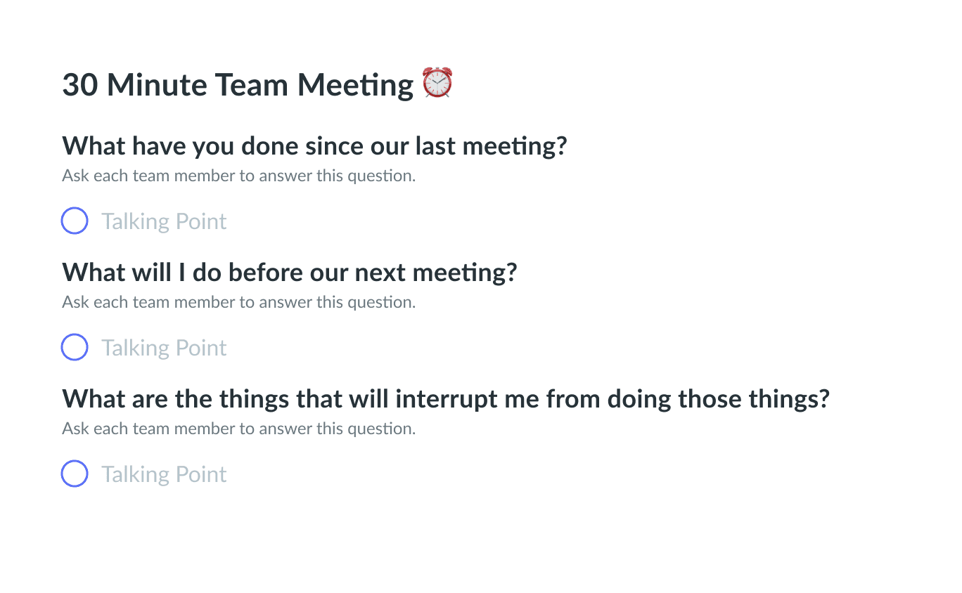 Need a quick team meeting? Try out this template for a productive 30 minute team meeting.