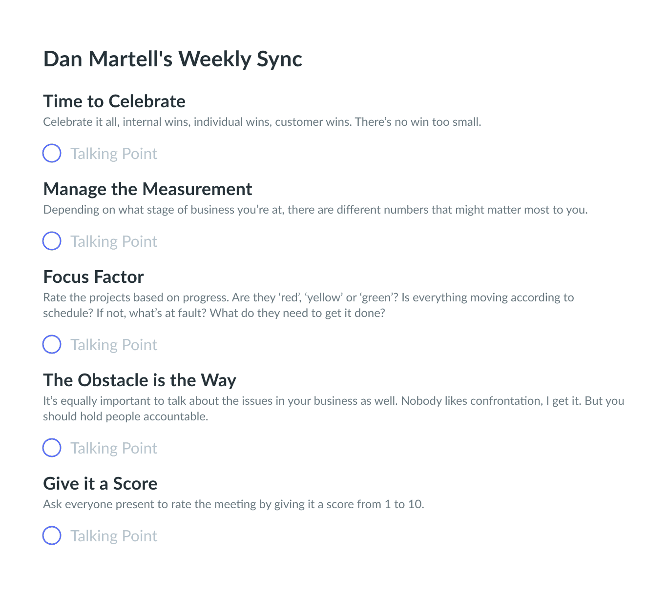 Run your weekly syncs like a pro with this template curated by award-winning SaaS founder coach, Dan Martell.