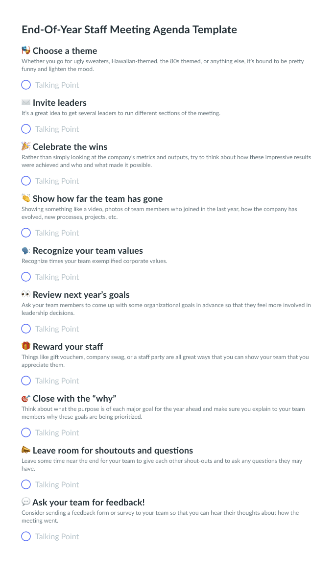 This template includes topics to run an effective, productive, meaningful, and fun end-of-year staff meeting the whole organization looks forward to.