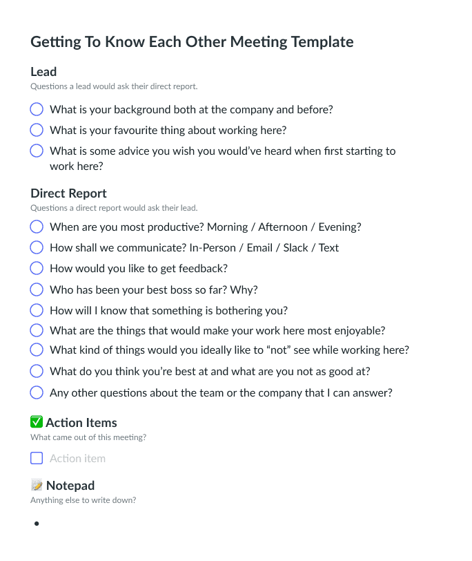 It's never too late to get to know your teammates. Use this Getting To Know Each Other Meeting Template to learn about their background and preferences.