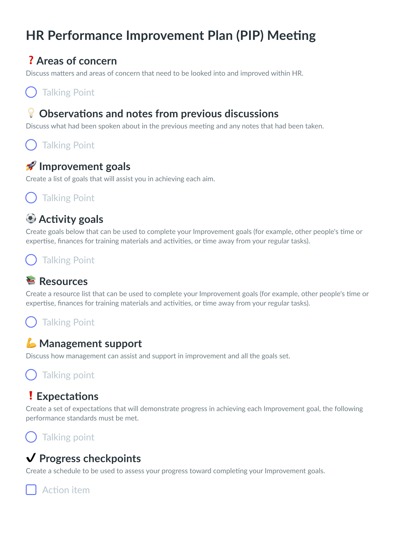 Help struggling employees get back on track with our PIP Meeting Template. This template, inspired by the University of Central Arkansas, is perfect for managers and team leads to create a structured plan, address concerns, and offer the opportunity for improvement. Use this template in Fellow to prepare the agenda in advance, take collaborative notes, and track next steps
