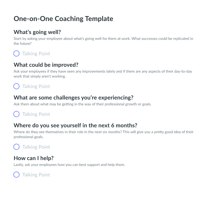 One-on-one coaching meetings give employees the time and appropriate space to discuss personal goals, issues, challenges and a way forward.