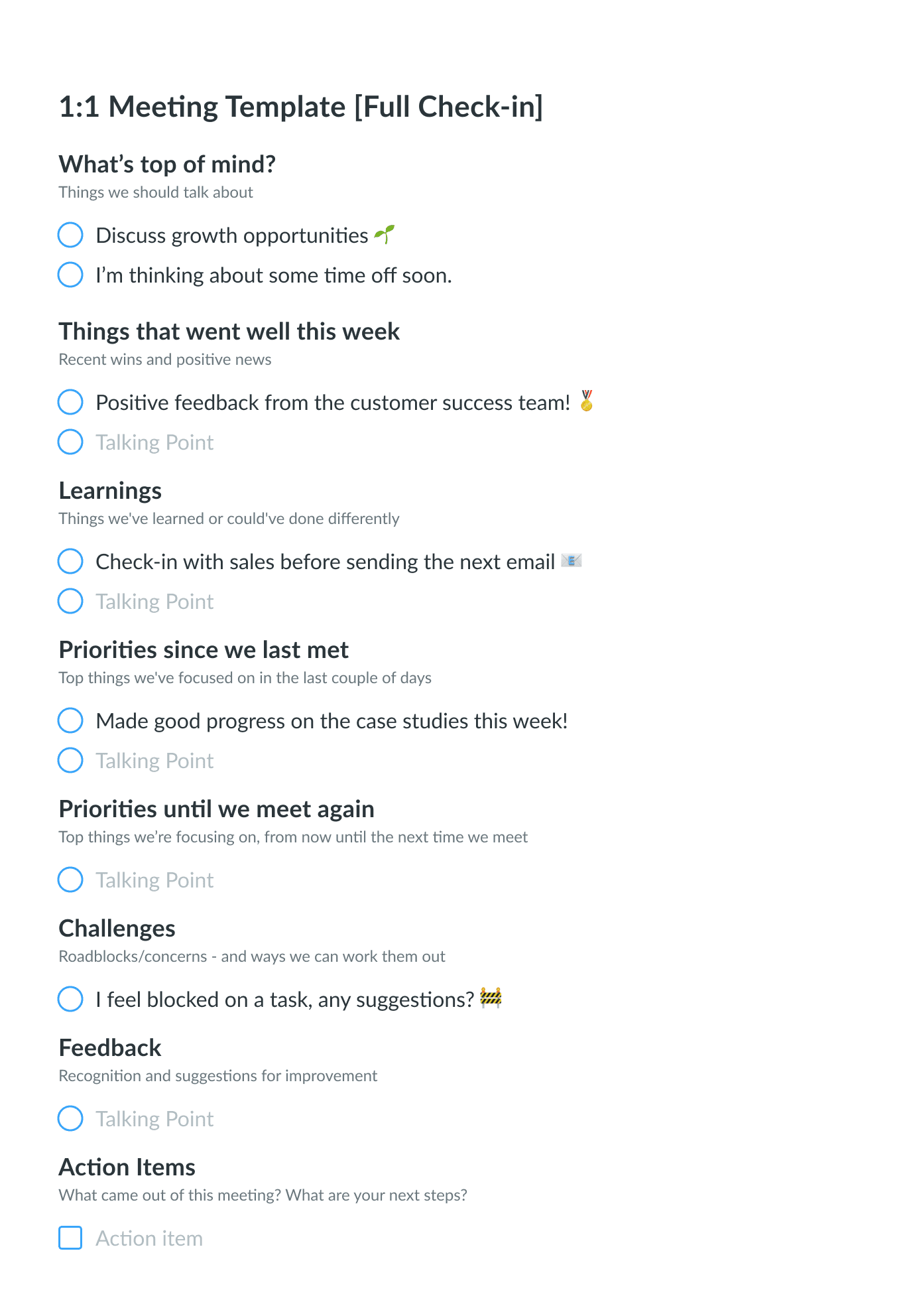 Make your employee check-in meetings impactful with our Check-in Meeting Template. Perfect for managers, this template helps structure discussions, address challenges, and exchange feedback. Use this template in Fellow for collaborative and structured 1-1s with clear outcomes and next steps.