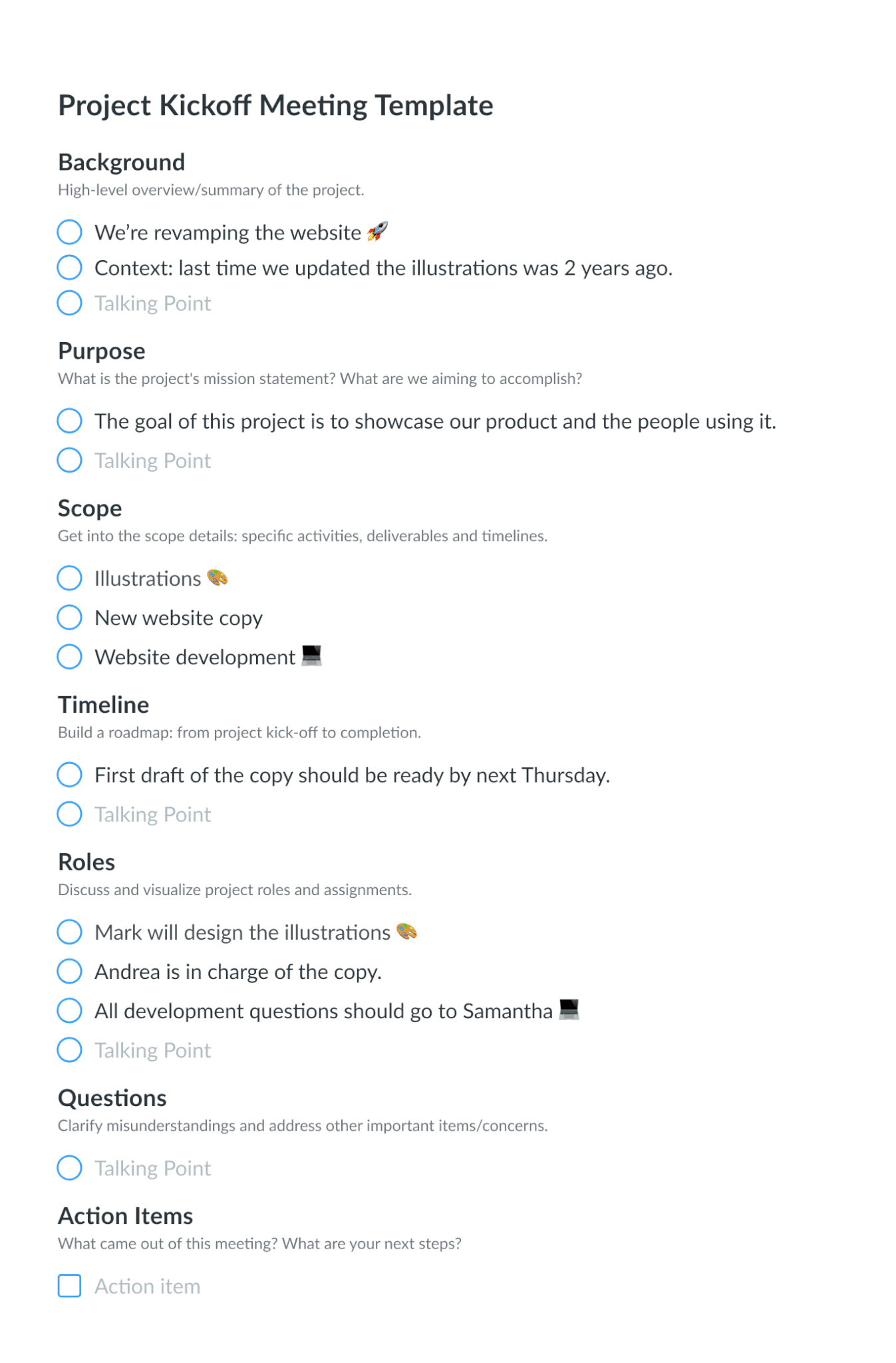 Launch your projects effectively with our Project Kickoff Meeting Template. Designed for project leaders, this template helps teams clarify objectives, assign action items, and set milestones. Use this template in Fellow to delegate tasks, set due dates, and maintain a record of all project discussions.