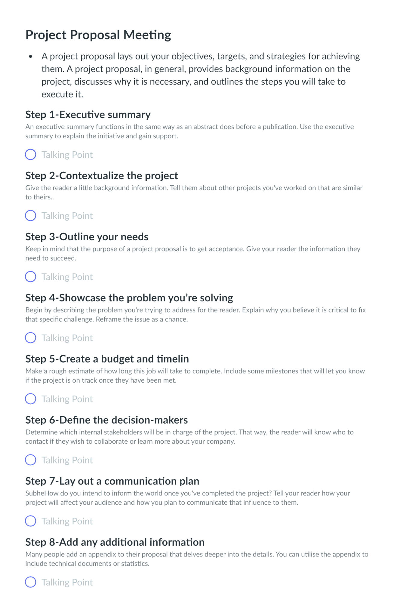 Present your project plan confidently with our Project Proposal Meeting Template. Designed for project managers and leaders, this template is structured to discuss proposals, gather feedback, and secure approval. Use this template in Fellow to share the agenda in advance, add private notes, and track next steps