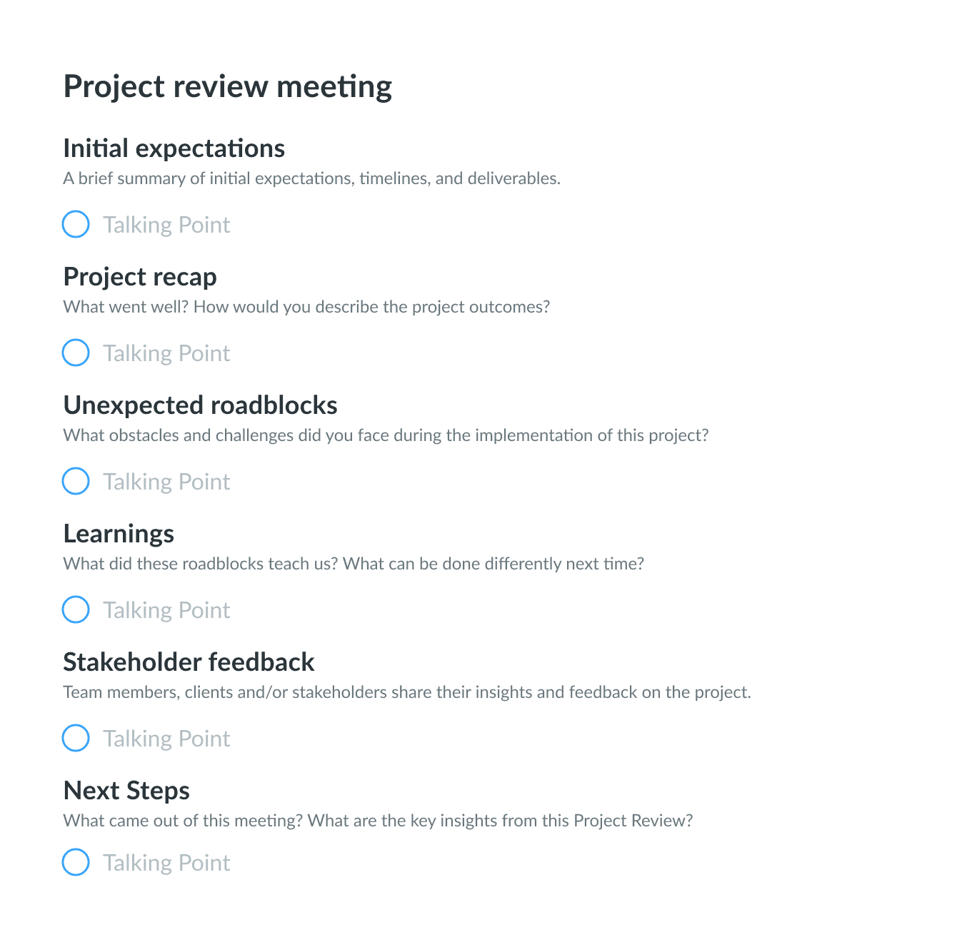 Reflect and plan with the Project Review Meeting Template. Perfect for project teams and leaders, this tool helps discuss what went well, identify improvements, and plan for future projects. Use this template in Fellow to add talking points, take notes collaboratively, and assign action items.