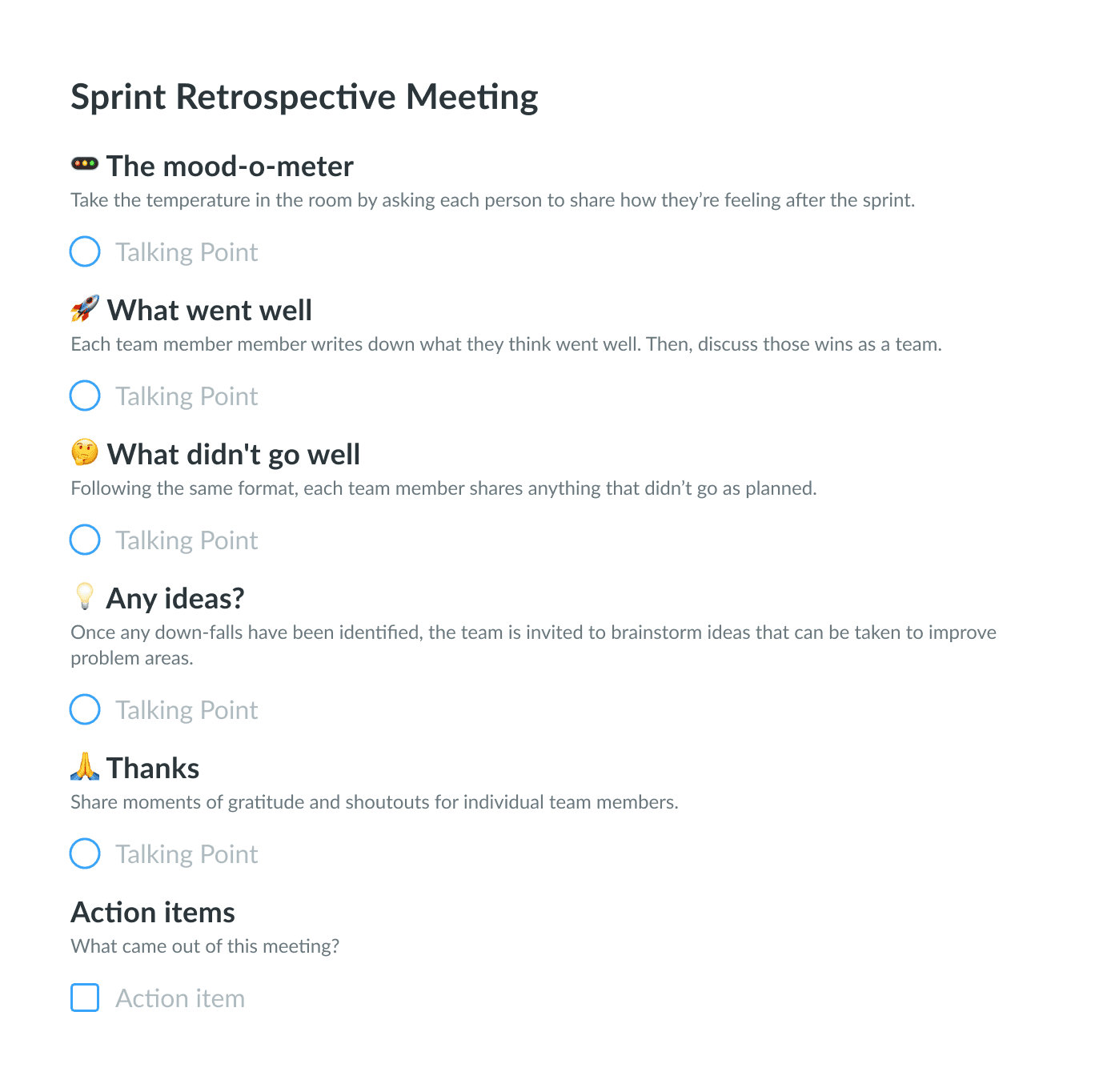 Use this sprint retrospective template to reflect on the sprint, identify past pitfalls, and propose new ideas.