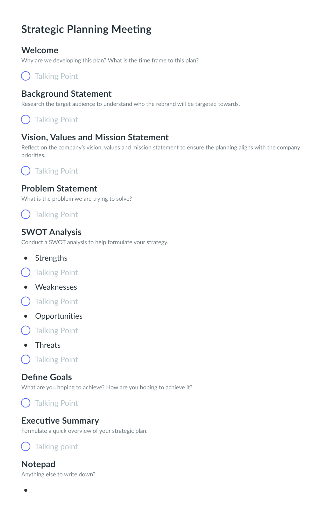 Strategic planning is a process used to define goals and the steps required to accomplish them. Use this meeting template to align the goals of a team or department with the company at large.