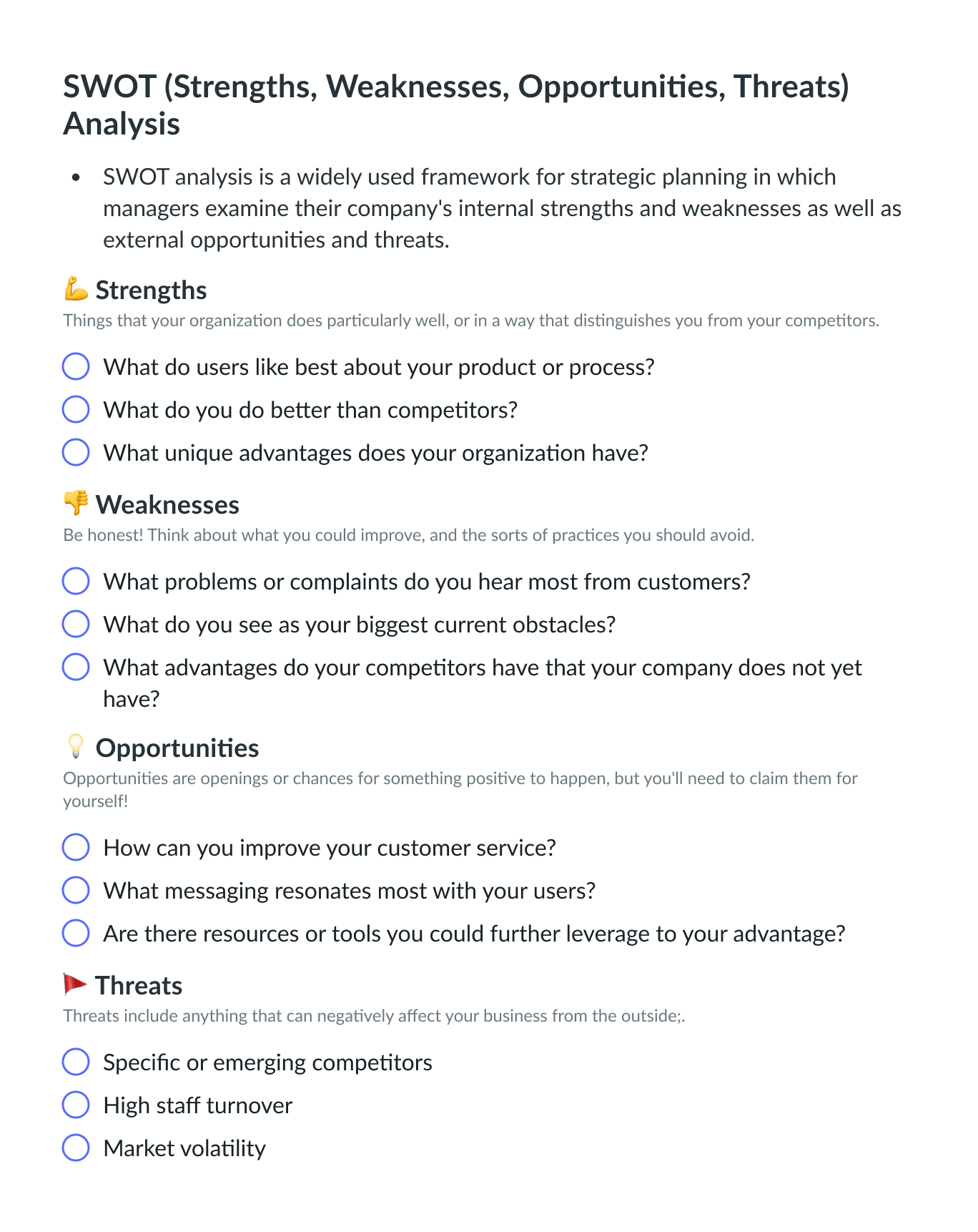 Use this template to examine your company's internal strengths and weaknesses as well as external opportunities and threats.