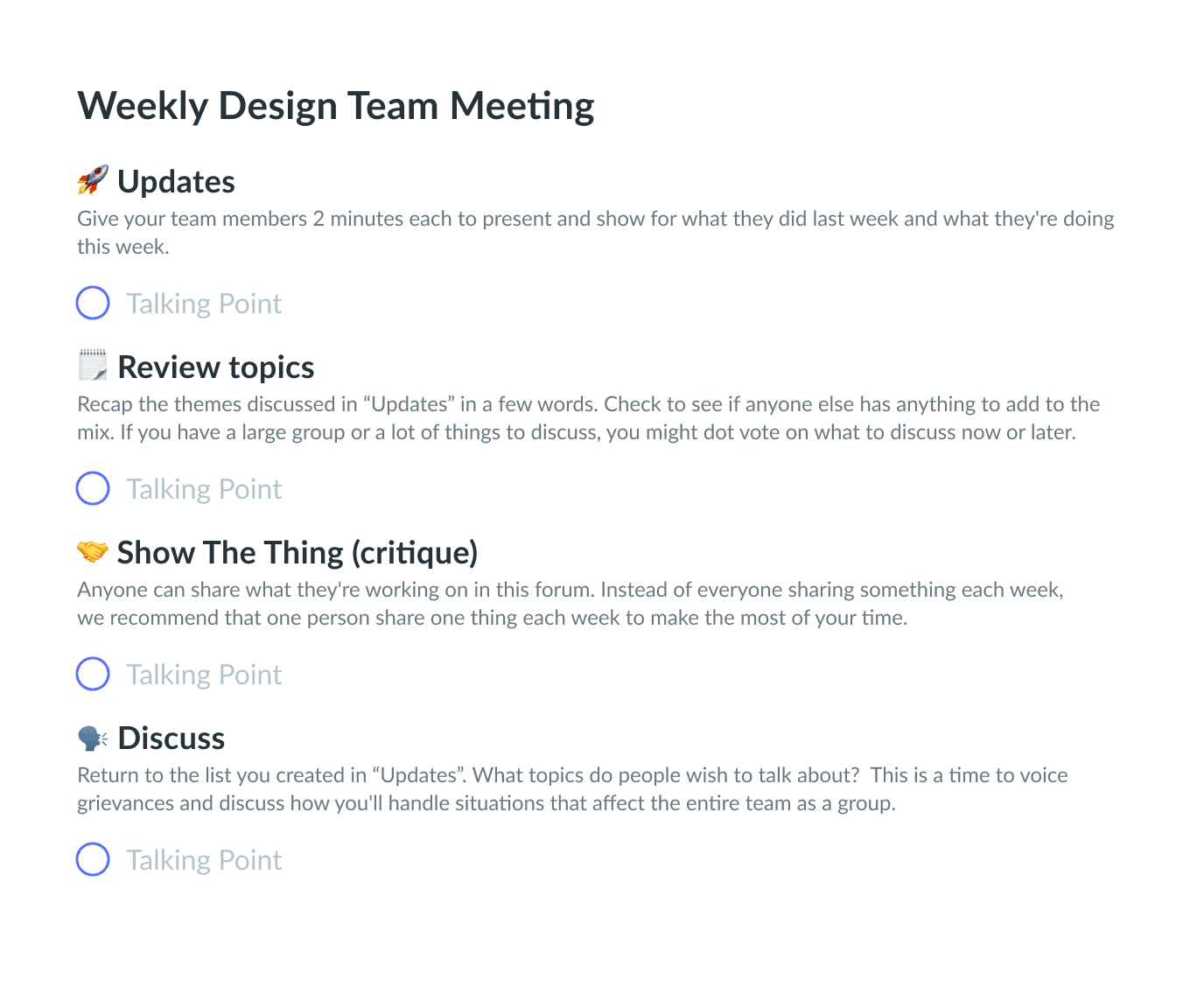 Foster collaboration within your design team with our Design Team Meeting Agenda Template. Perfect for design teams, this template helps keep everyone aligned while providing space for feedback. Use this template in Fellow to collaborate in advance, embed relevant documents or Figma files, and track next steps.