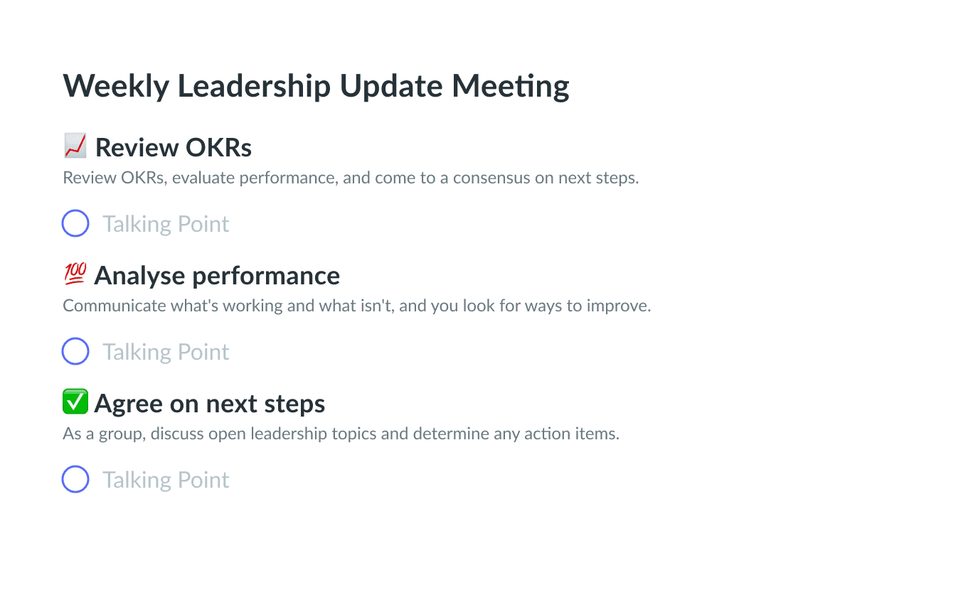 Use this weekly leadership update meeting template to create an objective, clarify people's roles and embrace trust between your team members.