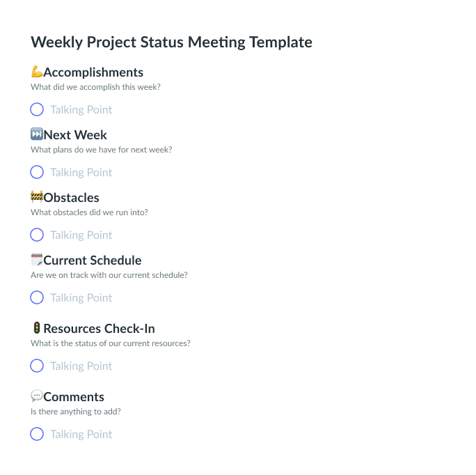 Reflect on what your team accomplished this week, how the week went overall, and what you are working towards for next week during your project status review. This will help end the week on a good note and set your team up for success the next week!